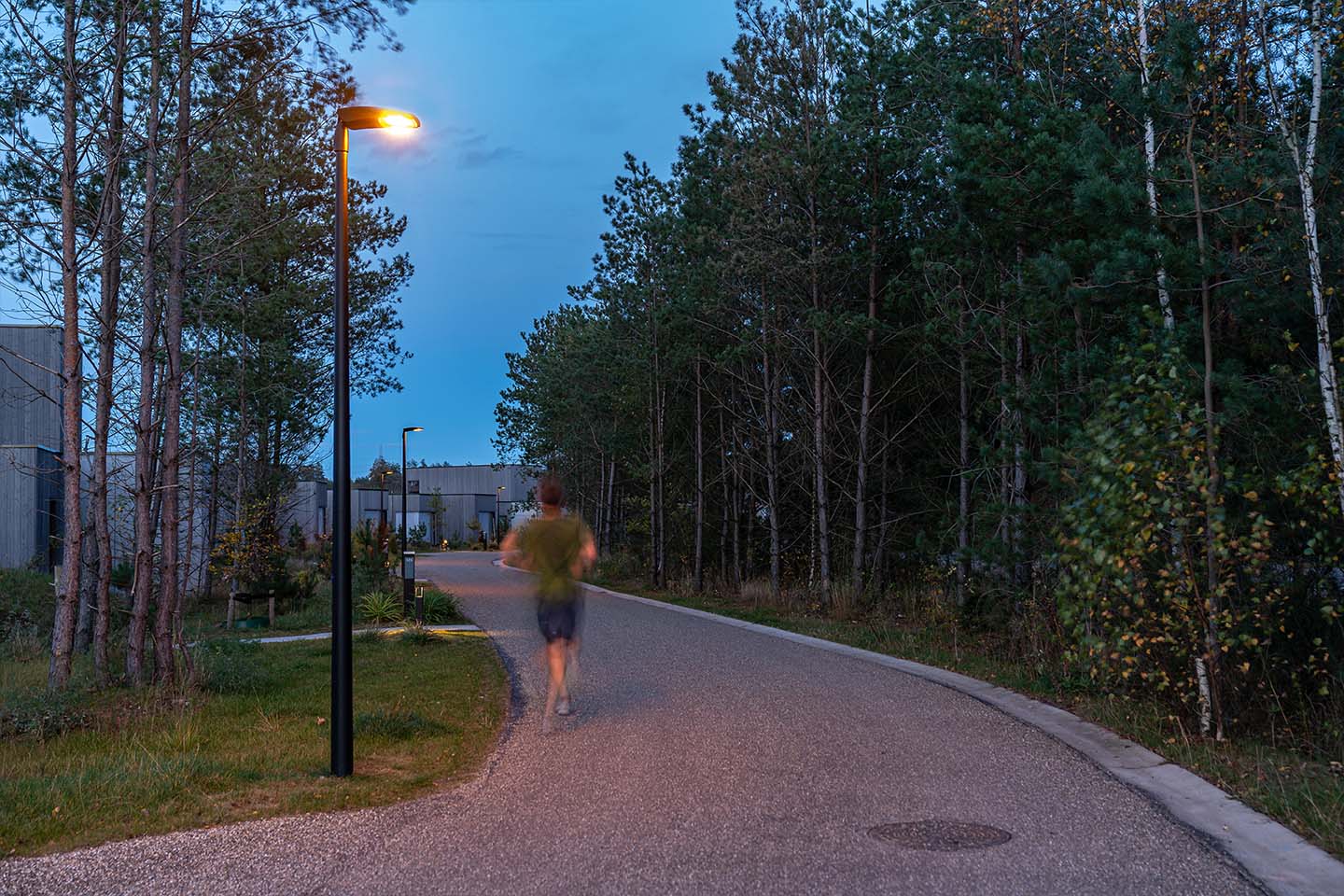 Pour répondre à ces critères, Schréder BE a proposé le luminaire TECEO S avec contrôle de flux arrière et verre plan. Ce luminaire à haute performance photométrique permet de diriger la lumière précisément où elle est nécessaire, en ne générant aucun flux de lumière vers le haut (ULOR 0%). Fabriqué avec des matériaux durables et recyclables, ce luminaire respecte les principes de l’économie circulaire et maximise les économies d’énergie pour un éclairage respectueux de l’environnement. Le TECEO S, le plus petit de la gamme TECEO, se fond naturellement dans l’environnement du parc. De plus, 84 TECEO 1 étaient déjà présents dans le domaine de Terhills et éclairent le tracé de la navette autonome. En proposant le TECEO S, Schréder BE assure une harmonie esthétique sur l’ensemble du domaine.