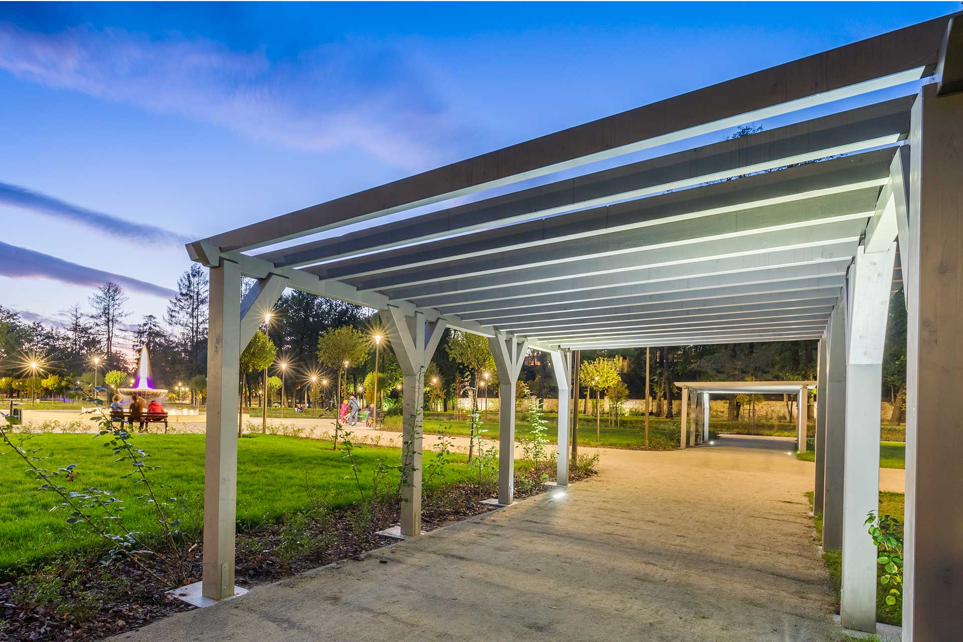 Les pergolas du parc sont éclairées par des projecteurs Terra Midi et Trasso qui contribuent à créer des espaces confortables pour échapper à l’agitation de la ville et admirer les vues et le ciel nocturnes.