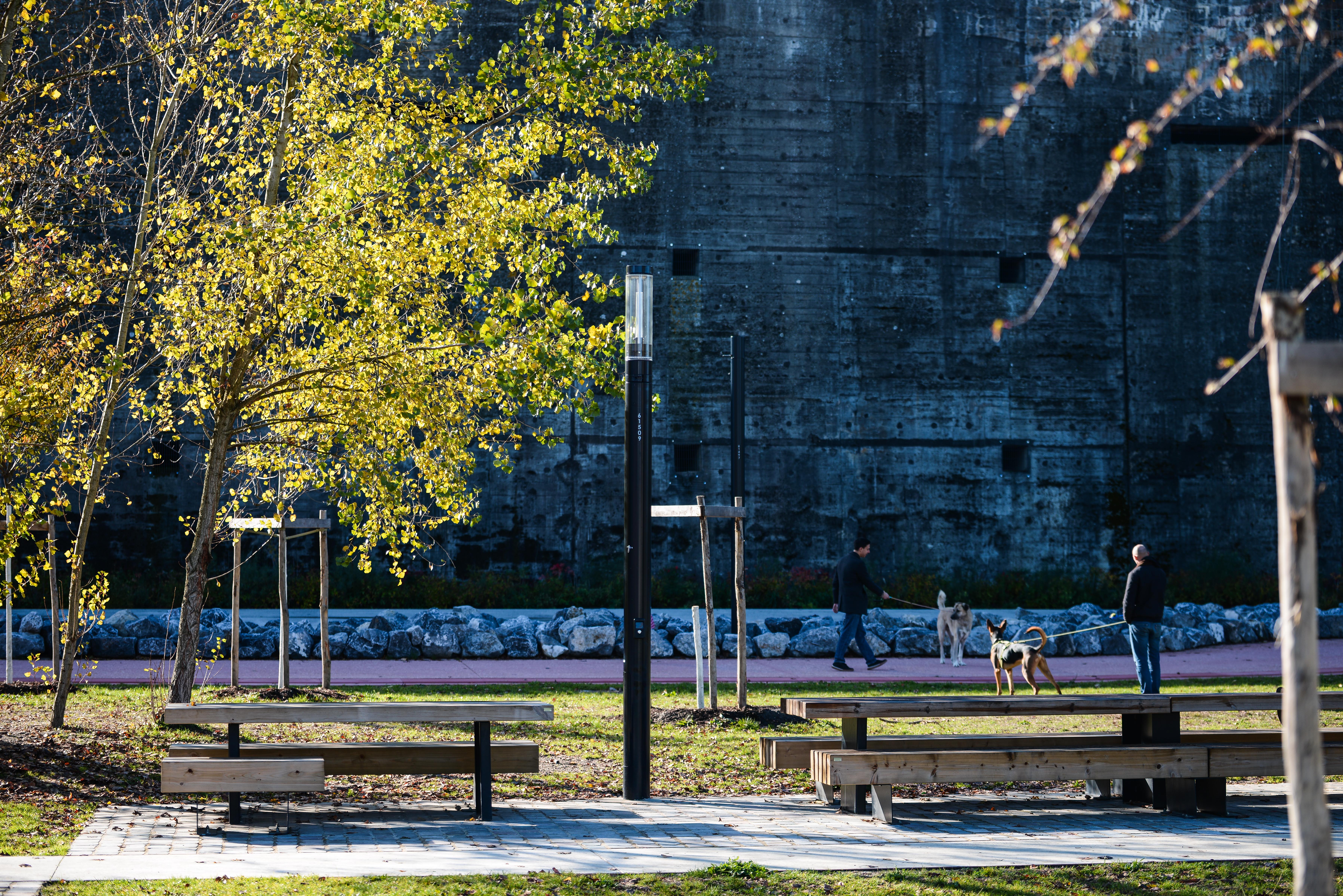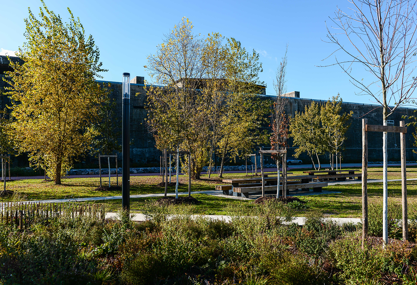 Sur près de 4 hectares, à l’arrière de la Base sous-marine dans le quartier des Bassins à flot, un ancien site largement bitumé a laissé place à un parc public paysager. Cette transformation s’inscrit dans une logique forte de désimperméabilisation des sols : retrait du revêtement minéral, restitution de pleine terre, plantations, gestion alternative des eaux pluviales et amélioration du confort thermique estival.