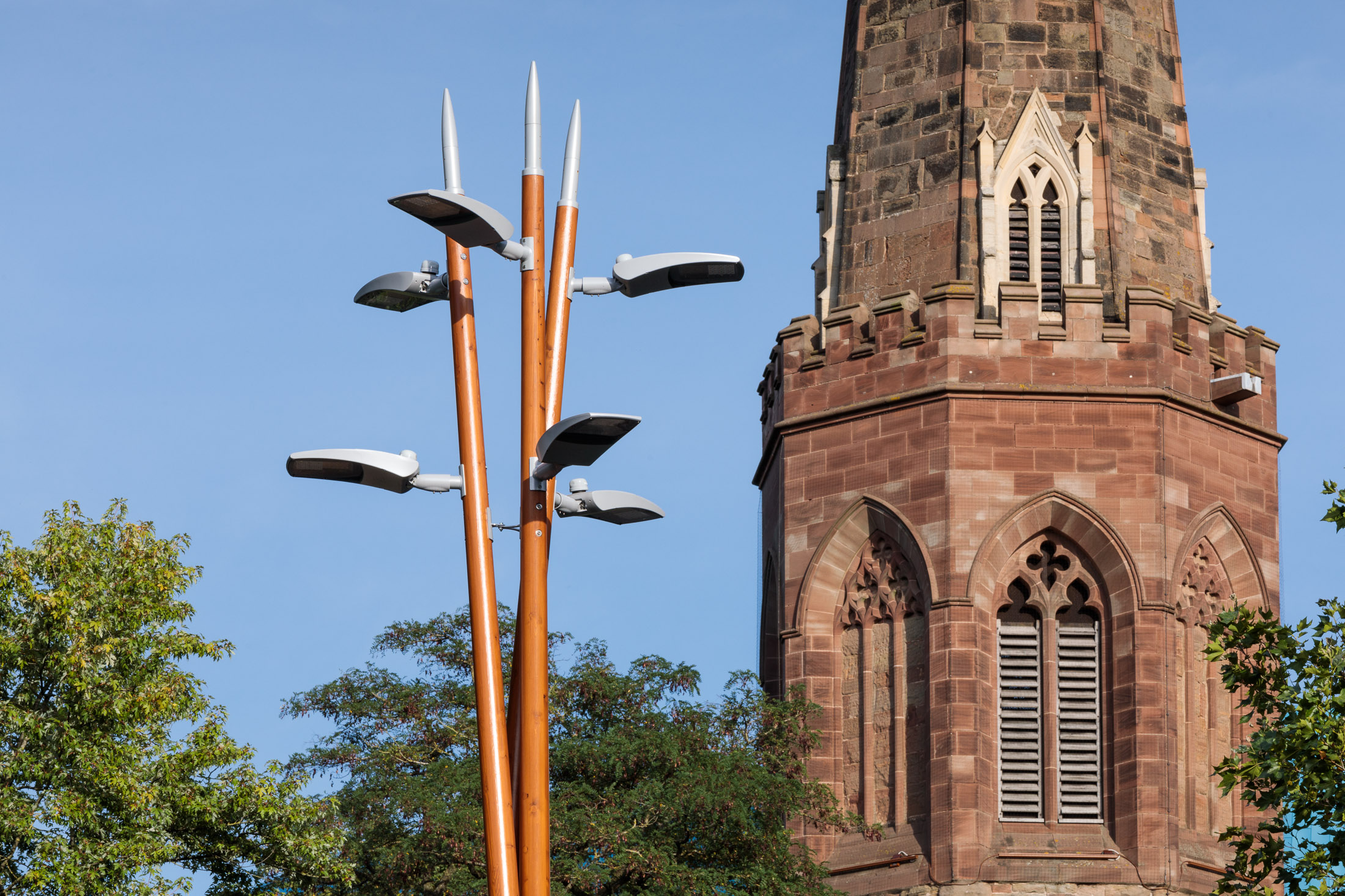 Schréder a collaboré avec Valmont pour concevoir une magnifique colonne triple mât sur mesure destinée à accueillir le luminaire écoénergétique TECEO.